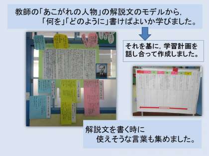 教科書教材「百年後のふるさとを守る」の中に出てくる「儀兵衛」について,どこにあこがれるか,またその理由は何かを明らかにしながら読み進めています。そこで学んだことを生かして,「マイブック」である自分が選んだ伝記の「あこがれの人物」について解説文を書いていきます。そこで,本や文章に書かれている,人物の業績や出来事を取り上げて,あこがれる理由をまとめていきます。