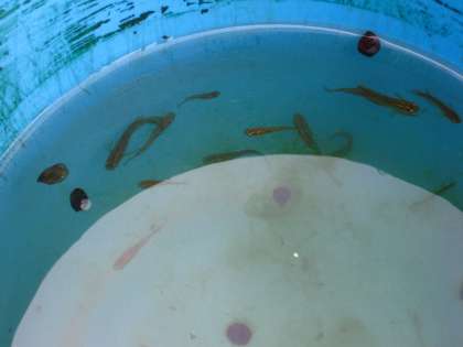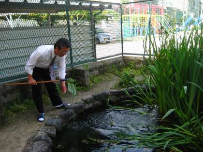 2年前にひょうたん池にやってきた20ひきほどのめだかが,今では数え切れないくらいに増えました。ちょっぴりさびしいけど,そのめだかがよその学校で元気に泳ぐ姿を思い浮かべると,それはそれでうれしくなります。