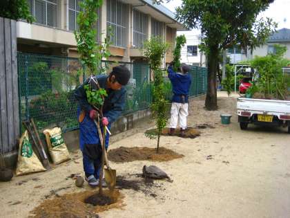 6月2日(木),企業からの寄贈による植樹が行われました。ナンキンハゼ,モクレン,ムグゲ,コムラサキシキブ,アギサイ,クロガネモチ,ウメ,ナンテン,ユキヤナギ,ジンチョウゲ。どれも今まで本校になかった,秋に色づく木,実のなる木,花が咲く木等々,全部で20本。これから,子どもたちは四季折々に変化する木々に季節を感じ,豊かな心を育んでいくことでしょう。