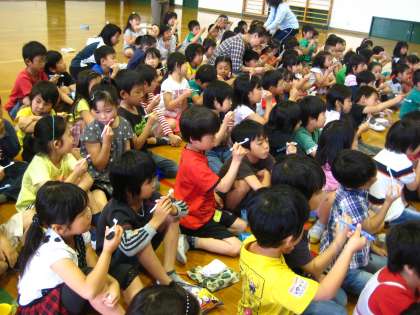 3つの大切なことを教わりました。みんなお話をよく聞いて,歯磨きの練習もしっかりできました。最後に音楽に合わせて歯磨きをしました。中尾先生の歯ブラシの動きを見ながら,一生懸命同じ動きを真似する子どもたち。かわいい!