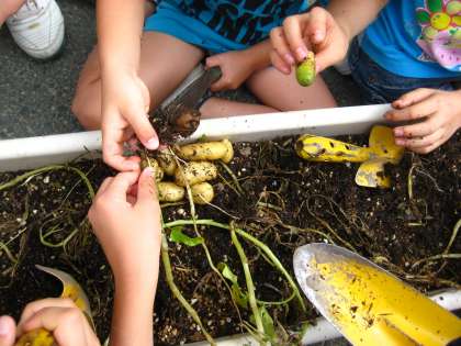 今日の1つ目の活動は,ジャガイモの採り入れ。プランターを掘り返してみると,かわいいジャガイモがころころ。おいしそう!