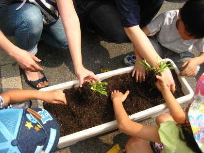 2つ目の活動は,4月に蒔いた種から育った苗の植え替えです。キバナコスモス,アグロステンマ,マリーゴールドの苗をプランターに植え替えました。夏には私たちの目を楽しませてくれることでしょう。