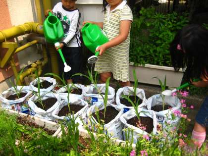 3つ目の活動は,トウモロコシの苗植え。土の袋の口を開き,そこに植えます。即席の植木鉢です。花壇のない庭やベランダなどにおすすめ。おうちでも試してみてください。袋の下のほうに穴を開けるのをお忘れなく。