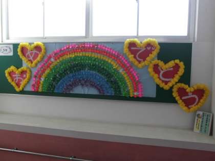 6年生の掲示板は大きな花束が印象的です。5年生は,たくさんの折り鶴で虹を描いています。