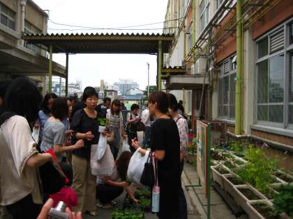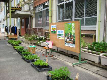 日曜参観恒例になった,苗のプレゼント。今年も玄関前には,たくさんの苗が並べられました。アサガオ,ゴーヤ,マリーゴールド,キバナコスモス,アグロステンマ,ケイトウ・・・中でも人気は,カボチャ,オクラ,チコリなど食べられる野菜で,すぐに売切れてしまいました。この苗は,みどりクラブで種まきして,育ててきたものです。
