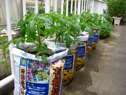 その際,プレゼントの苗の中に加えられなかった「トマトの苗」を差し上げます。ご希望の方は,職員室まで取りに来てください。先着30名様です。ちなみに学校では,袋栽培しています。