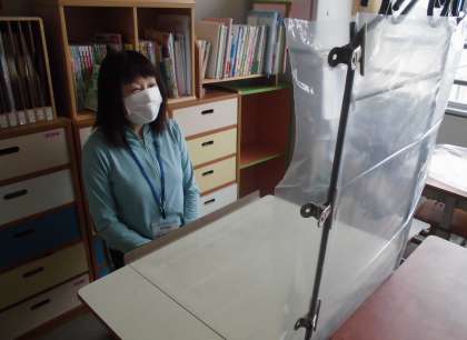 基本個別指導の教室ですので,対面する必要がある場合には写真のようなシートを張ります。管理用務員さんの木下先生が手伝ってくださり,準備万端です。