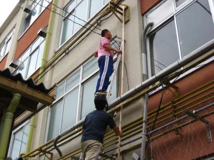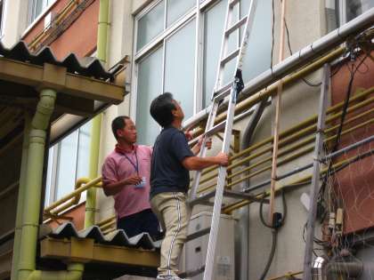 今年も緑のカーテンの季節がやってきました。先日のみどりクラブで植え替えたアサガオのつるがくんくん伸びて,1段目のネットを越えそうに。急遽ネットを張ることになりなした。去年は校長先生が一人で張られたのですが,今年は強力な助っ人が・・・山下先生です!見る間に4段目まで張られました。