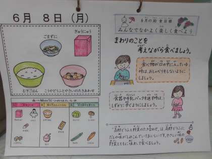 毎月の給食カレンダーの表紙には給食目標が書いてあります。6月の給食目標は,「みんなでなかよく楽しく食べよう・食べ物について知ろう」です。給食室には,1か月間掲示しています。また、6月8日の給食カレンダーにも書かれていました。