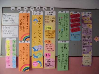 各学年の今年度の目標が決まりました。北校舎1階東入口の「こころの日」の掲示板に掲示してあります。