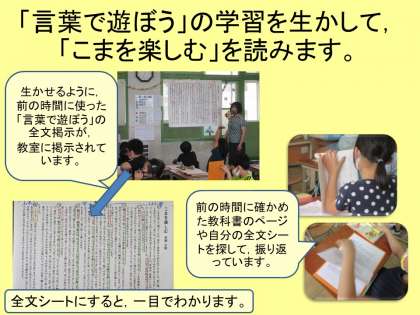 3年生の国語の学習を見に行きました。休校中の家庭学習でも読んでいた説明的文章「言葉で遊ぼう」「こまを楽しむ」を読む学習です。