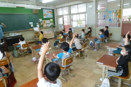 1年生は国語科で「ねこと ねっこ」という学習をしています。促音をしっかりと意識して筆記することは,はじめはとても難しいため,本校ではたいよう教室と連携して,音韻についての感覚を習得できるようにしています。音韻の数を拍手の数と一致させたり,つまる音のところではぎゅっとこぶしをにぎったりして,体の動きで徐々にリズムを身に付けていきます。授業の終わりの方には,「っ」の付く言葉を考えて発表しました。「きって」「らっぱ」「ほっとどっぐ」自分の考えを発表したい子がたくさん!!一生懸命手を挙げていました。