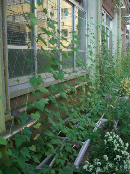 「みどりクラブ」第1回目の活動で種まきをしてから、約二か月がたちました。アサガオやヘブンリーブルーはどんどん成長し、早いものはもう二階へ届こうとしています。そして、そろそろ「緑のカーテン」の姿を見せ始めました。
