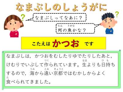 生節のしょうが煮は,生節をしょうが・砂糖・みりん・しょうゆで作った煮汁で煮含めています。「ごはんによくあう」と,ご飯と一緒にたべていました。「骨がないから食べやすい」との感想もありました。