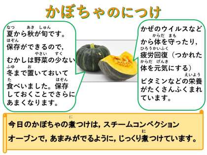 かぼちゃはこれからが旬の時期です。朱七校では,スチームコンベクションオーブンを使って煮つけました。スチームを使ってじっくり加熱するので,皮までやわらかくやさしいかぼちゃのあまみがひきたちます。子供たちも「めっちゃおいしい」「皮もおいしいよ」「あまい」と喜んで食べていました。