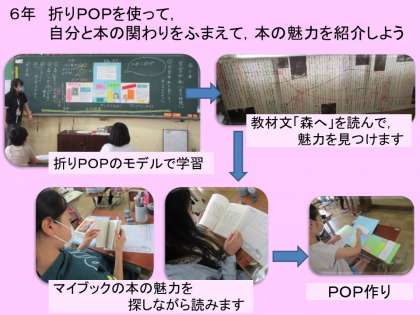 そして,自分が選んだ本(マイブック)を読み進めていきます。5年生は,好きな作家を決めて,同じ作家の本を2冊選びます。6年生は,テーマを決めて,そのテーマにつながる本を3冊選びます。すぐに本を選べた人もいれば,なかなか選べなくて,困ってしまった人もいました。5年生と6年生では本の選び方は異なりますが,選んだ本を読み進めてその魅力を探すという点は共通しています。そして,見つけた魅力をカードに書いていき,友達に紹介します。高学年では,登場人物の人物像や物語などの全体像を想像しながら読むことが求められています。
