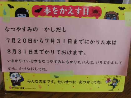 夏休みの読書の取組として,子供たちが選んだ本をおうちの方に読み聞かせをする「読書郵便」とおうちの方の読み聞かせを聞く「読書郵便」の二つの宿題があります。児童が夏休みを利用して家族と本について話す機会をもち,読書の楽しさを家族と共有することをめあてとしています。