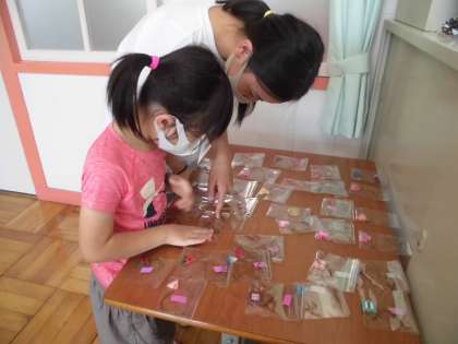 3組は,数の学習だけでなく,ボールを渡すときの言葉かけやお土産のアイロンビーズを一緒に選んでおすすめしたりもしています。一緒に学ぶからこそ力になることがたくさんあると感じています。新型コロナウイルス感染症の対策もしっかりしながら,共に学ぶことの素晴らしさも体験していきたいと思います。