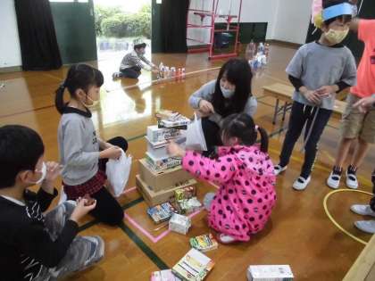 10月27日(火)2時間目には、2年1組が生活科の学習で「がらくたモール」に招待してくれました。招待状をもってきくれたペアの友達が教室まで迎えに来てくれました。がらくたで作った楽しい遊びのコーナーが盛りだくさん!すてきな景品のおみやげもあって,楽しい時間を過ごすことができました。
