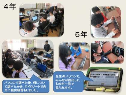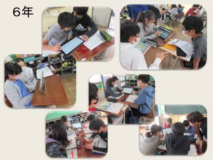 教室でも,少しずつ,タブレットを使った授業を行っています。特に,高学年では,自分で調べたり,調べたことをまとめたりすることに,タブレットを使っていきます。一人1端末もつようになれば,自分が学習したことを,教職員機に送ることで,教員は一人一人の学びの様子を一覧にしてみることができます。もちろん,子ども同士も必要に応じて,友達の考えなどを見合うことができます。