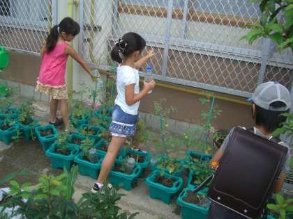 2年生は、ミニトマトに水をやるとき、いつも近くにある雨水タンクの水を活用してくれています。ところが、