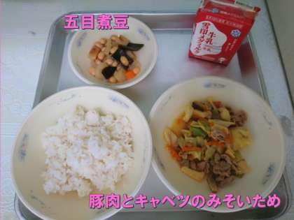 今日の献立は,「麦ごはん・牛乳・豚肉とキャベツのみそいため・五目煮豆」でした。
