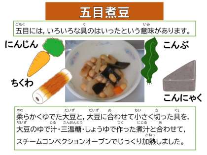 五目煮豆は,やわらかくゆでた大豆と,にんじん・こんにゃく・ちくわ・にんじんを,大豆のゆで汁・三温糖・しょうゆで作った煮汁と合わせてスチームコンベクションオーブンでじっくり加熱しました。大豆の甘みやちくわ・昆布のうまみなどが具材にしみて,やさしい味ですがごはんによく合う献立です。大豆とに合わせて小さく切った具材でお箸の練習もできました。