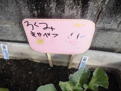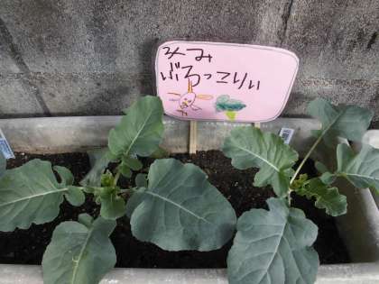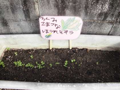それぞれのプランターに野菜の名前を書いた札を作って立てました。カラフルでかわいくなりました。コマツナは芽が出てきました。苗も成長してきています。ホウレンソウの芽はまだ出てきませんが大切に育てていきたいと思います。