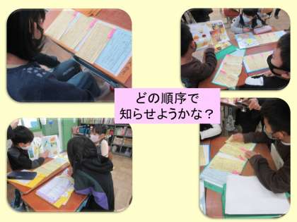 情報が集まると,今度は伝えたい情報にしぼっていきます。さらに,どの順番で伝えるかを考えていきます。ここでは,自分一人で考えて決めることも必要ですが,友達に相談して,アドバイスやヒントをもらうこともできます。グループで交流するときには,もととなる本のページをめくりながら,一緒に考える場をもちました。