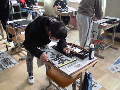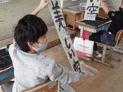書写の学習で「書初め」をしました。今日は練習ということで,書初め用紙と同じ大きさに切った新聞紙で練習しました。半紙と違って長い紙なので,字の大きさやバランスに注意しながら「美しい空」を何回も練習しました。明日は,書初め用紙に清書します。