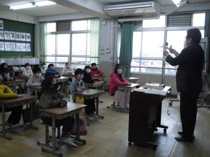 ものづくり体験学習がありました。京都生き方探究館から先生をお迎えして,教えていただきました。まず,生活を支える京都のものづくりについて学習しました。京都は歴史の町のイメージが強いですが,最先端の技術で様々なものをつくりだし,世界に発信している町であることを教えていただきました。