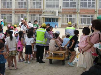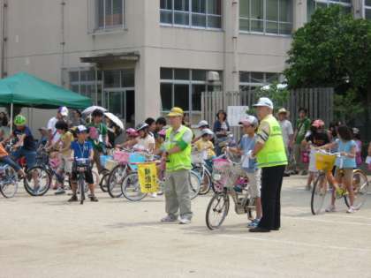開会式の後,運動場で自転車教室が行われました。交通ルールを守って運転したり,難しいコースに挑戦したりしました。運動場を1周するミニ新幹線の乗り場は大混雑でした。
