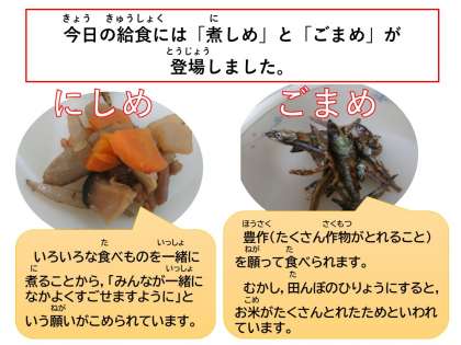 ごまめは豊作を願って食べられます。すぼし(ごまめ)を田んぼに肥料としてまくと豊作だったことから,「田作り」ともいわれます。給食では,カリッなるまでこげないようにじっくりと炒った後,さとう・みりん・料理酒・しょうゆでつくったたれをからめて,最後にごまをからめました。カリカリとした歯ごたえと,あまからい味を楽しみながら食べていました。ごはんにもよく合い,一緒に食べている子もいました。