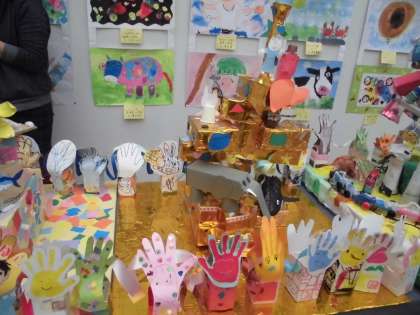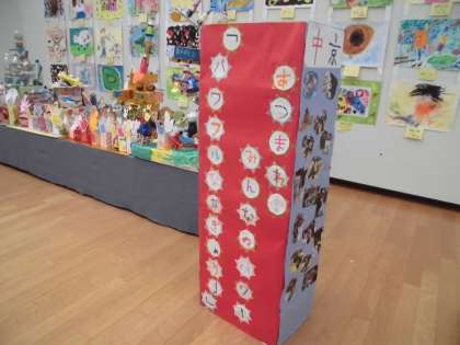 2月4日(木)から2月7日(日)まで,京都市美術館別館で「小さな巨匠展」が開催されていました。緊急事態宣言下でしたが,感染拡大防止対策を万全にして開催されました。中京支部は「あつまれ!みんなのパワー パワフルなかぎょう!」をテーマに合同作品を作りました。支部を4つのグループに分けてグループごとで合同作品を作りました。朱雀第七小学校は,朱雀第三小学校と一緒に「伝説の塔」を作りました。