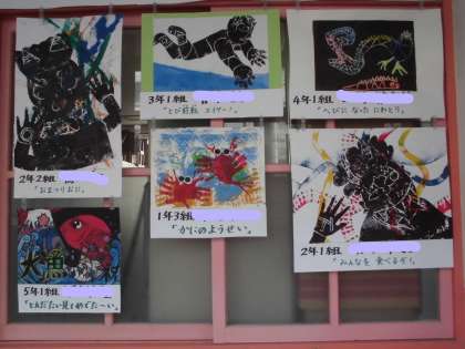 この時期に行われる予定であった「小学生絵画展」の開催が新型コロナウイルス感染症による緊急事態宣言発出のため中止となりました。校内で選考をした佳作や会場に展示される予定であった入選作品を北校舎1階の3組の隣,作業室前に展示しています。2週間程度展示する予定にしています。