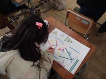 昼休み時間に3年生の教室を通りかかると,算数で学んだ三角形やひし形などのたくさんの種類を使って,いろいろな模様を集中して作っていました。