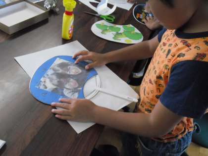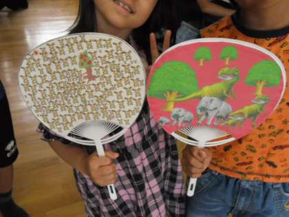 先生から作り方の説明を聞いたら,早速作成に取りかかりました。パソコンの中のうちわに,自由に絵を描いたり気に入ったスタンプを押したり,みんな楽しそう。そして,自分だけのオリジナルうちわの出来上がりです。どの子も出来上がったうちわをうれしそうに見せてくれました。