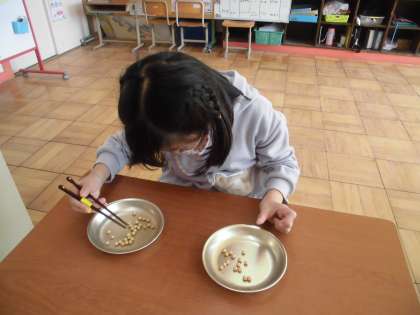 3組もお箸の使い方の練習をしています。ゴムQというお箸の練習用の教材を使って練習しています。シリコン素材で表面がすべりにくくなっていて,つまみやすくなっています。1年生は,お箸の持ち方をサポートするリングに指をいれて使うお箸を使って,ゴムQをつまんで練習しています。3年生は,お箸の先端がずれにくいサポートお箸を使ってごむQで練習した後,大豆をつまむ練習を始めています。なかなかうまくつまめない時もありますががんばって練習しています。