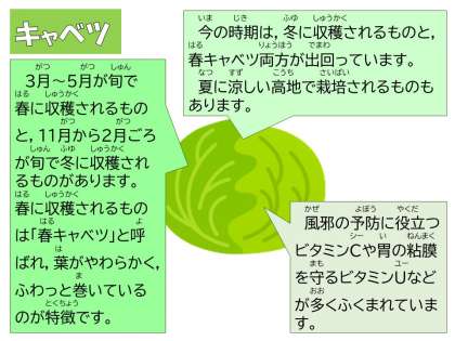 うずら卵とキャベツのいため煮は,キャベツ・にんじん・しいたけなど野菜たっぷりの献立です。豚肉やうずらと一緒にいためてたくさんの野菜が食べやすいようにしています。豚肉と野菜をいためたところに,水としいたけのもどし汁を入れて煮,塩・こしょう・しょうゆで味つけして,うずら卵を入れて煮てかたくり粉でとろみをつけました。具だくさんでごはんによく合う献立です。うずら卵が好きな子が多く,たくさん入っていて喜んでいました。キャベツは,年中見かけますが,とれる場所や種類によって旬が違います。今の時期は春キャベツも出てきて,冬のキャベツと両方が食べられます。柔らかい春キャベツは生でサラダに,しっかり食感と厚みのある冬のキャベツや煮物やいためものになど,献立によって使い分けるとどちらも楽しめますね。