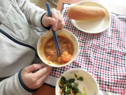 教の給食のビーフシチューの中にハート形の二ンジンが入っていました。給食調理員さんがみんなのために,こっそり入れてくれました。自分のお皿の中に入っているかな,とワクワクしながら食べていました。