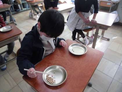 2月22日(月)から26日(金)は給食週間でした。給食週間の取り組みの一つに豆つまみ大会がありました。おはしの使い方を改めて見直してもらおうという取り組みです。
