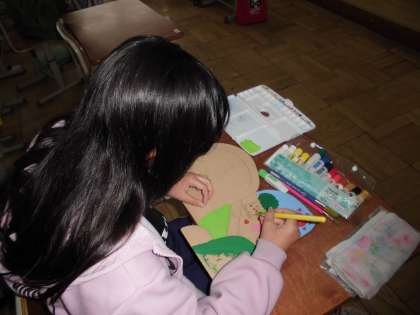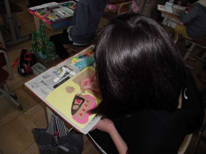 絵の具でのびやかに作成中です。いろいろな作品にハッとさせられます。