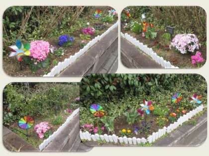 今朝,学校に来ると,校門前と校門を入ったところにたくさんの花が植えられていました。風車もあって,とても素敵な雰囲気で登校する子どもたちを迎えてくれました。