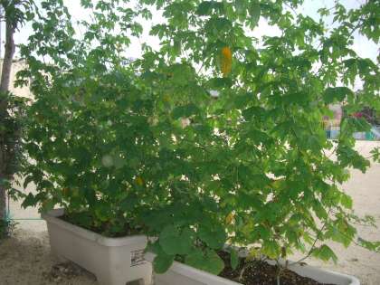 四年生が取り組んでいる「ゴーヤのトンネルを作ろうプロジェクト」のゴーヤも成長し、トンネルといかないまでもカーテンぐらいになってきました。実もたくさんぶら下がり、中には黄色く熟しているものもあります。