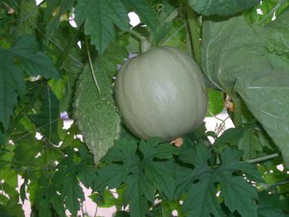 そしてなんとその中に、ゴーヤと並んでゴーヤとは違う植物が実をつけているのです。カボチャのような瓜のような…??? 何なのか、どうして生えてきたのか分かりません。もう少し様子を見てみます。