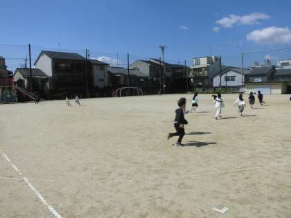 2時間目,運動場に出て遊んでよい場所と遊んではいけない場所を確認しました。子ども達はしっかり担任の話を聞いていました。その後,広い運動場をみんなで走りました。