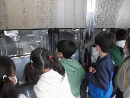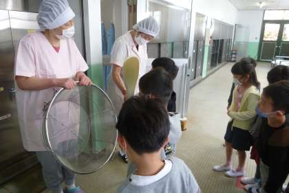 今日の2時間目に給食室へ見学に行きました。どこに何があるのか確認したり,どんな道具を使って給食が作られているのか見学したりしました。大きなザルや鍋,子ども達の背丈ほどあるオールには子ども達も驚いていました。