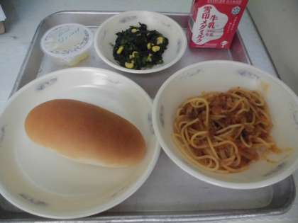 4月14日(水)から給食が始まりました。献立は,「小型コッペパン,牛乳,スパゲティ—のミートソース煮,ほうれんそうのソテー,りんごゼリー」でした。今日の献立は,入学をお祝いする「入学祝」の行事献立でした。