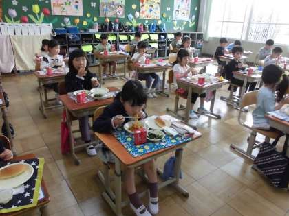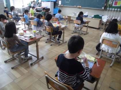 1年生にとっては、,初めての給食でした。静かにしっかりと食べていました。