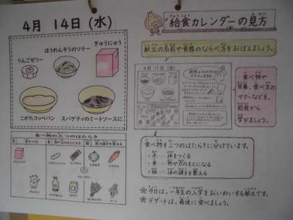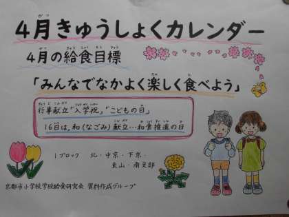 今月の給食目標は「みんなで仲よく楽しく食べよう」です。今月の行事献立は,4月14日(水)の入学祝献立と4月30日(金)の子どもの日献立です。そのほかにも,4月23日は「地産地消献立」,4月16日のには,和食推進の日「和(なごみ)献立」があります。